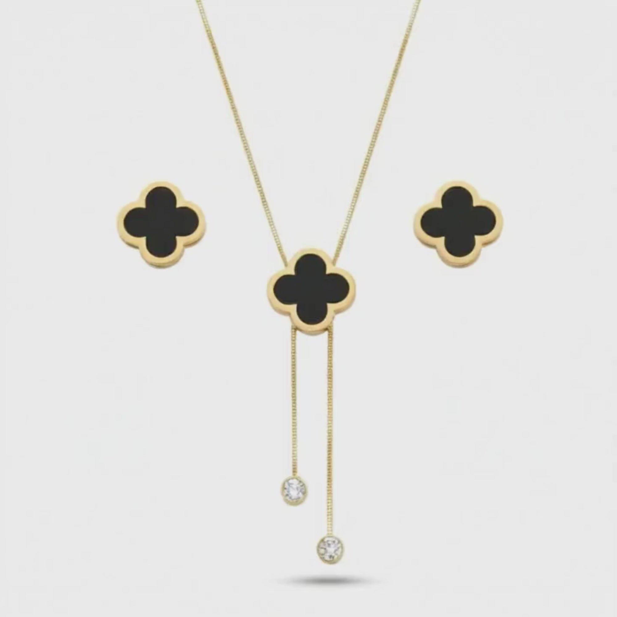 The elegant quatrefoil design features a sophisticated black center beautifully framed with premium gold plating. The adjustable lariat necklace includes two sparkling crystal drops, while the matching stud earrings complete the look perfectly.